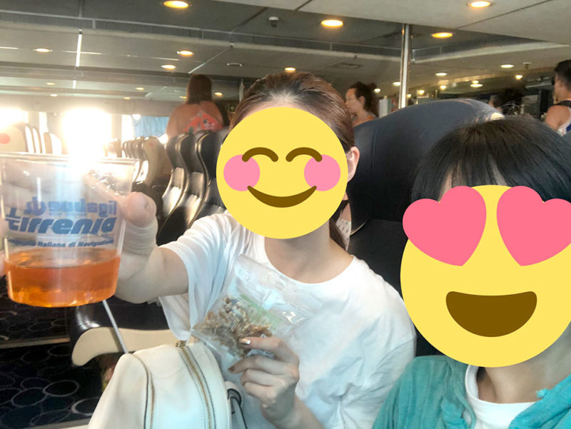 フェリーに乗る前にお昼ご飯を調達した方がいいです。島のバールやレストランは高価格。