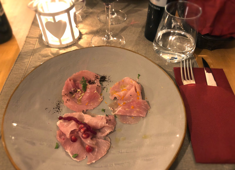 プロシュート(生ハム)やチーズ、ブルスケッタなど、軽いおつまみです。とはいえ、レストランで注文すると結構量があります。